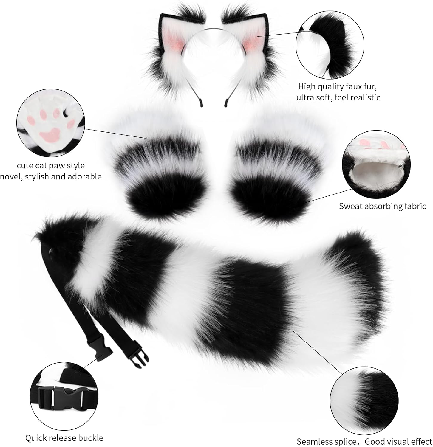 JUNBOON Faux Fur Cat Ears and Wolf Fox Tail Set Adult Kids Claw Glove Kit for Halloween Anime Cosplay Party